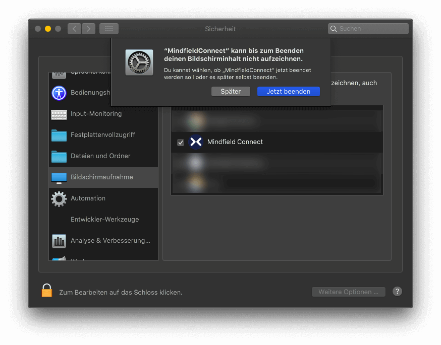 Bestätigen Sie die Beendigung von Mindfield Connect und starten